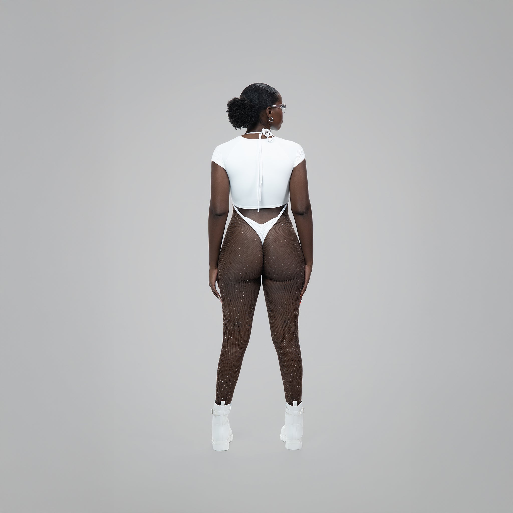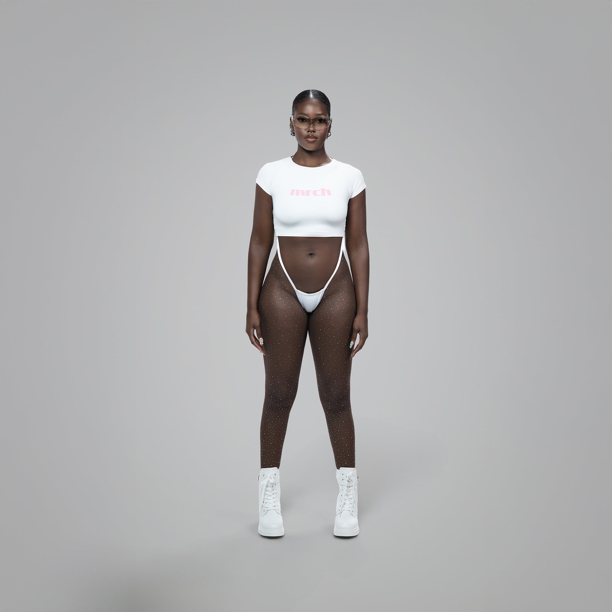 Introducing the MRCH Super High GEMZ Stockings, designed to seamlessly blend with ultra high-cut carnival costumes. These stockings feature an ultra-high waistband with a super low cut in the front and back, ensuring the neatest look. Our stockings can be attached to your costume bikini bottom by looping the straps through the end loops on either side of the stocking waist or by using the included safety pins. Our skin-tone fishnet has a matte finish and a slightly thicker knit that enhances its durability on the road.